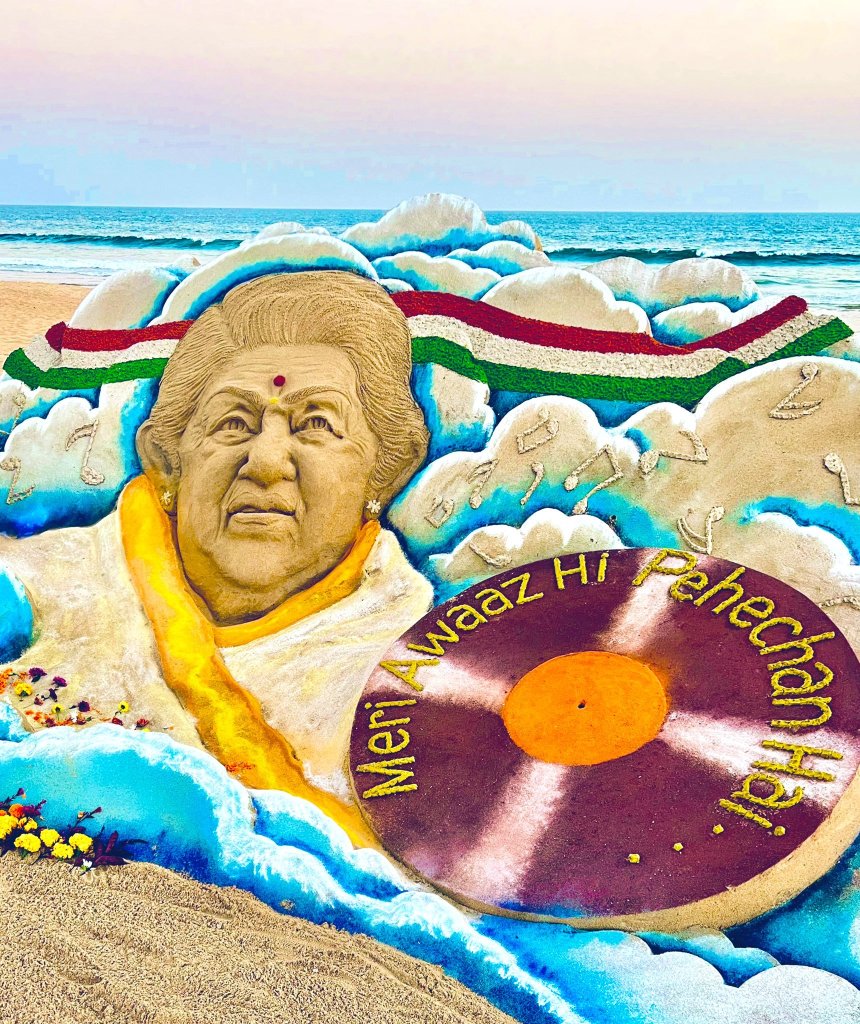 A tribute to the nightingale of India by sand sculptor Sudarsan Pattnaik.